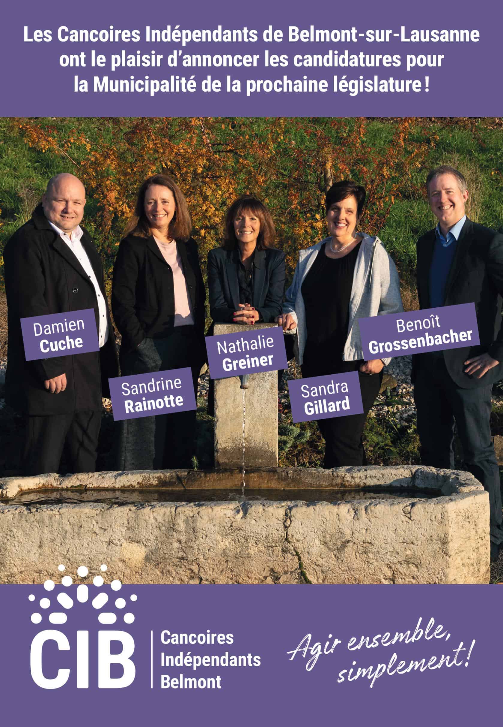 Les Cancoires Indépendants de Belmont-sur-Lausanne (CIB) ont le plaisir d’annoncer leurs candidates et candidats à la Municipalité pour la prochaine législature 2026-2031.