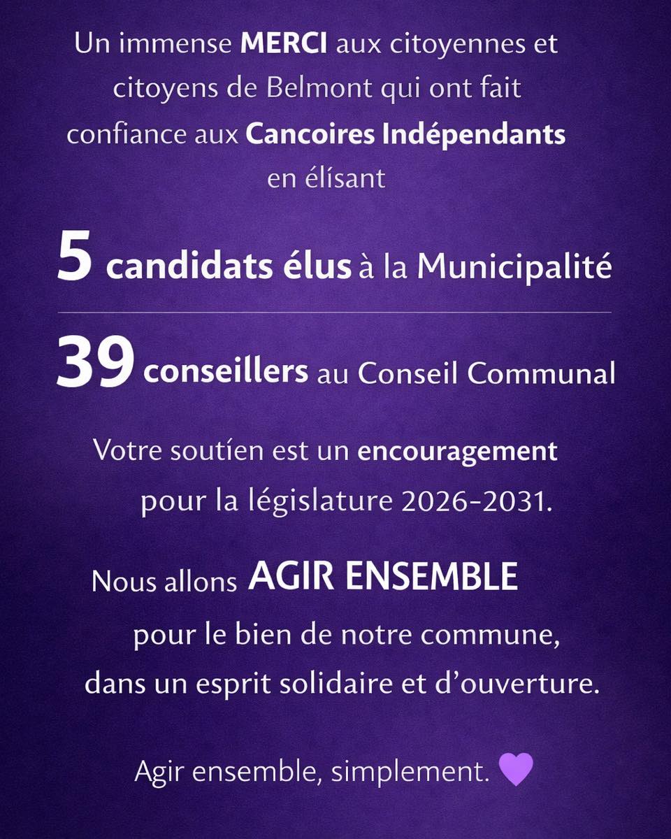 Un grand merci aux citoyennes and citoyens de Belmont-sur-Lausanne qui ont fait confiance aux Cancoires Indépendants de Belmont en élisant 5 candidats municipaux et 39 conseillers !