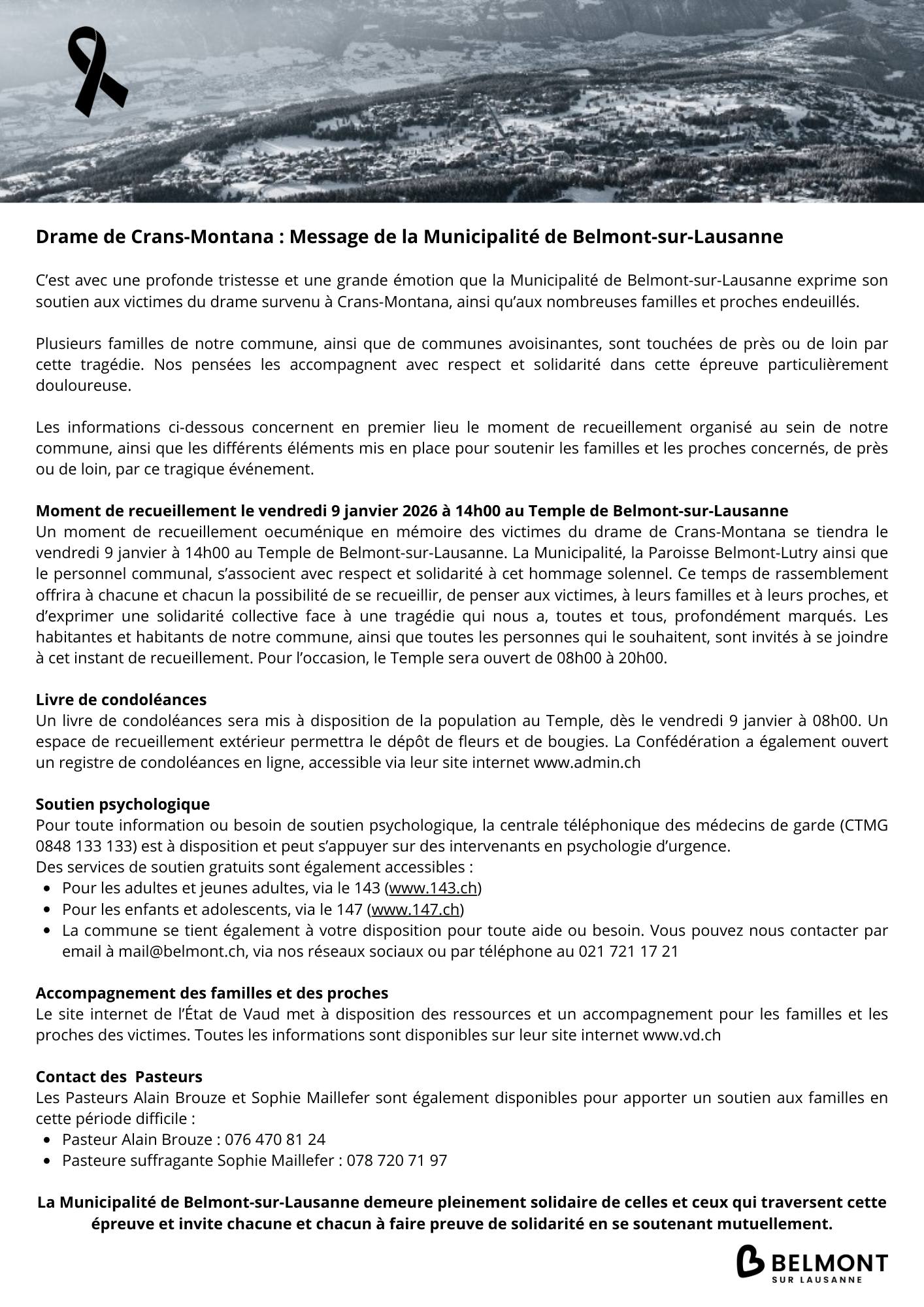 Les CIB s’associent au message de la Municipalité de Belmont-sur-Lausanne et adressent leurs pensées les plus sincères aux victimes du drame de Crans-Montana, à leurs familles et à leurs proches.